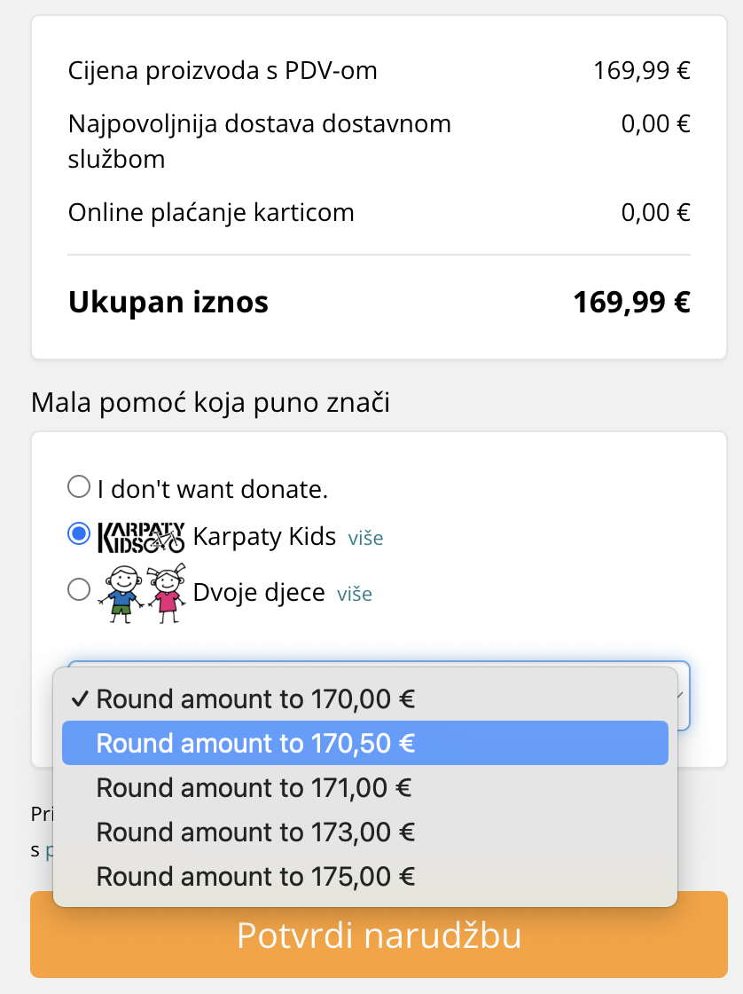 Naručite u našem webshopu bilo koje igračke i u zadnjem koraku vaše narudžbe, prije konačne potvrde, odaberite opciju zaokruživanja vrijednosti vaše narudžbe. Prikupljeni iznos ćemo u cijelosti predati izravno udruzi Karpaty Kids.